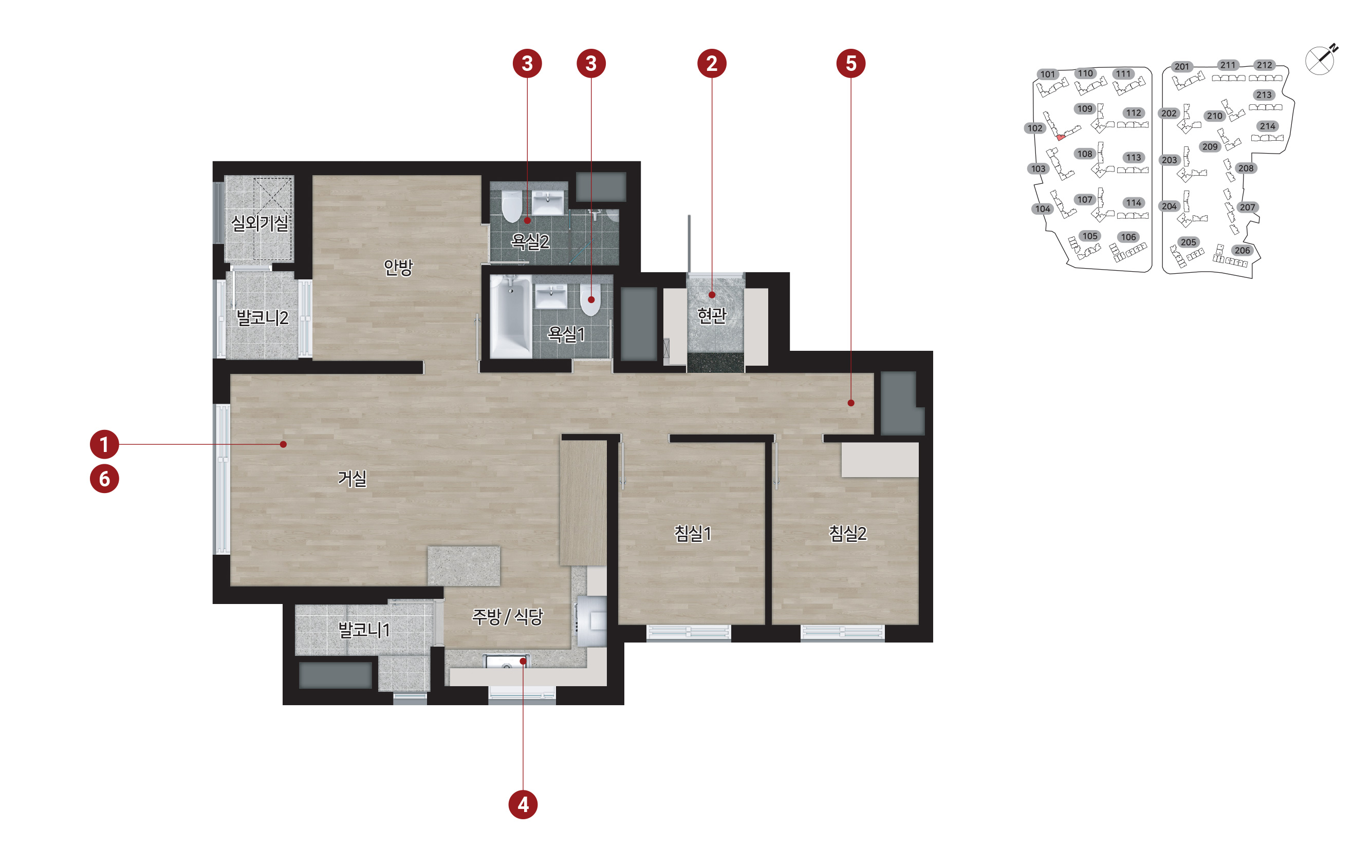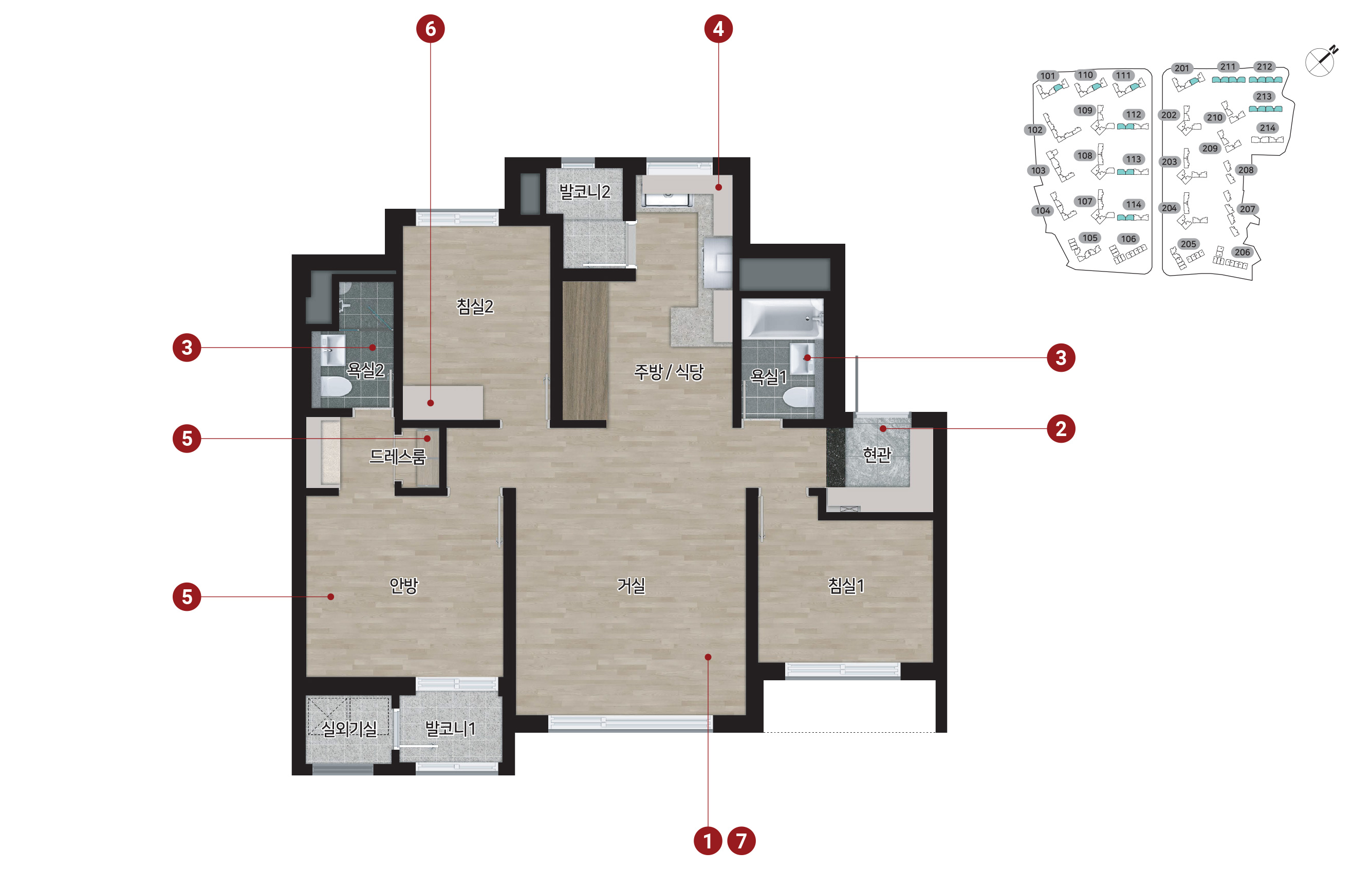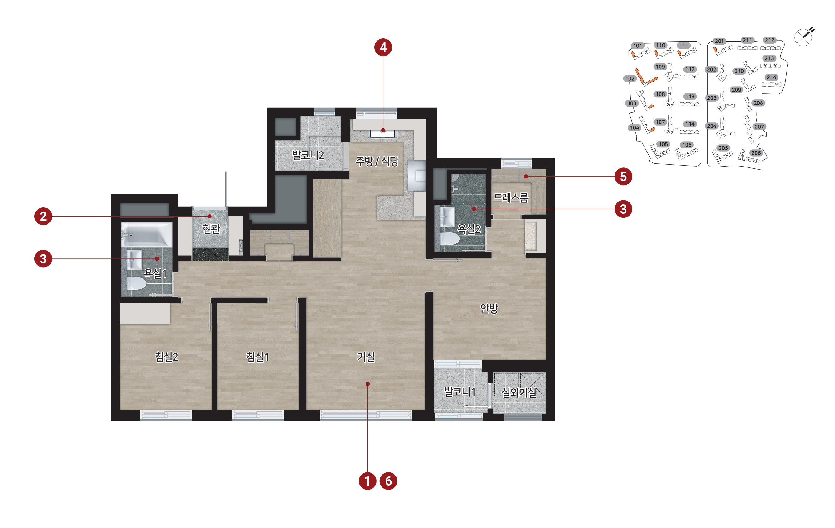 잔여 물량은 전용 74㎡ 중심으로 3베이 판상형과 탑상형이 공존합니다. 맞통풍이 가능한 구조, 드레스룸과 팬트리, 현관 수납을 반영해 체감 면적을 키웠습니다. 힐스테이트 메디알레는 세대별 전용 창고도 제공되어 계절가전과 레저용품 보관이 수월합니다.