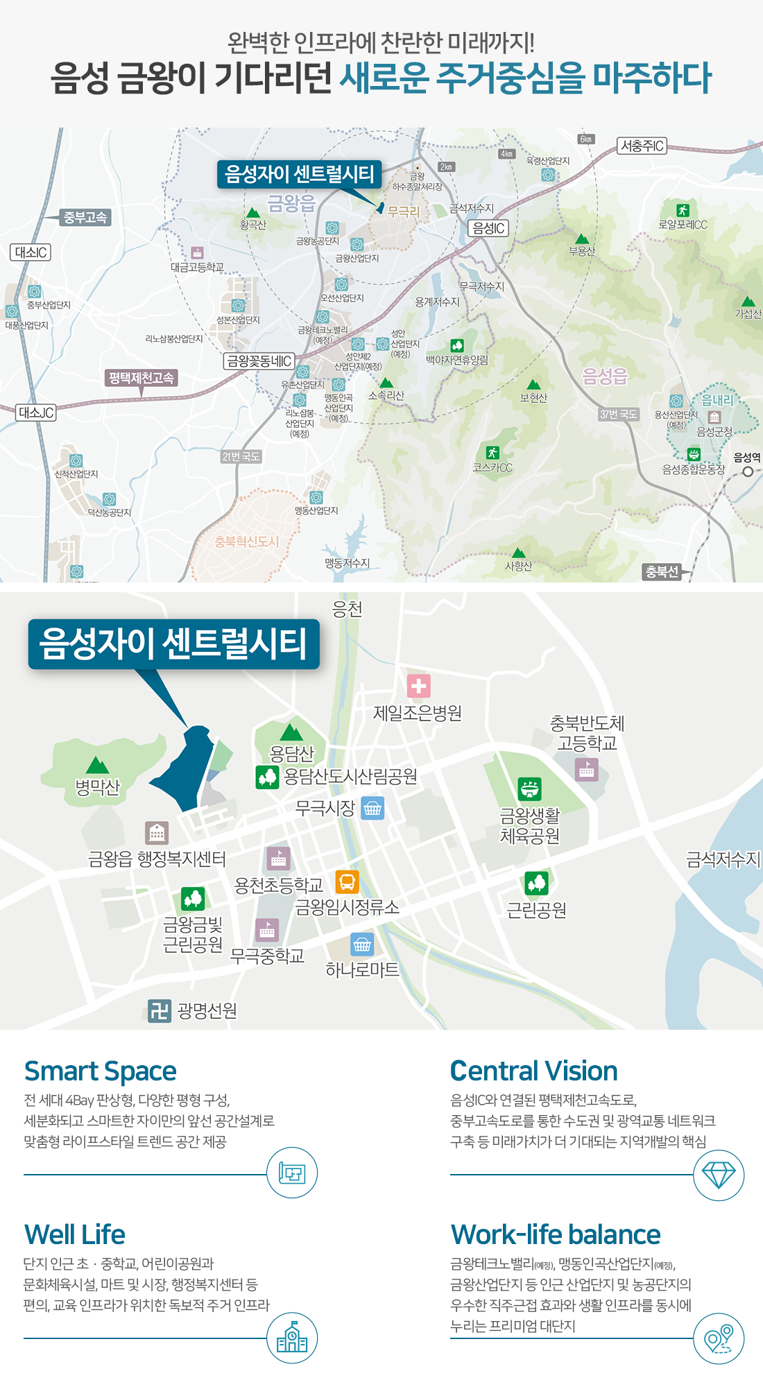 금왕일반산단·금왕농공단지·배송 물류센터와 한화·CJ 계열 생산거점이 인접한 직주근접 입지입니다. 안정적인 일자리 축과 생활 축이 겹치는 ‘생활-고용 동심원’ 구조가 형성돼 실수요 흡수력이 높은 음성 자이 센트럴시티 입니다.