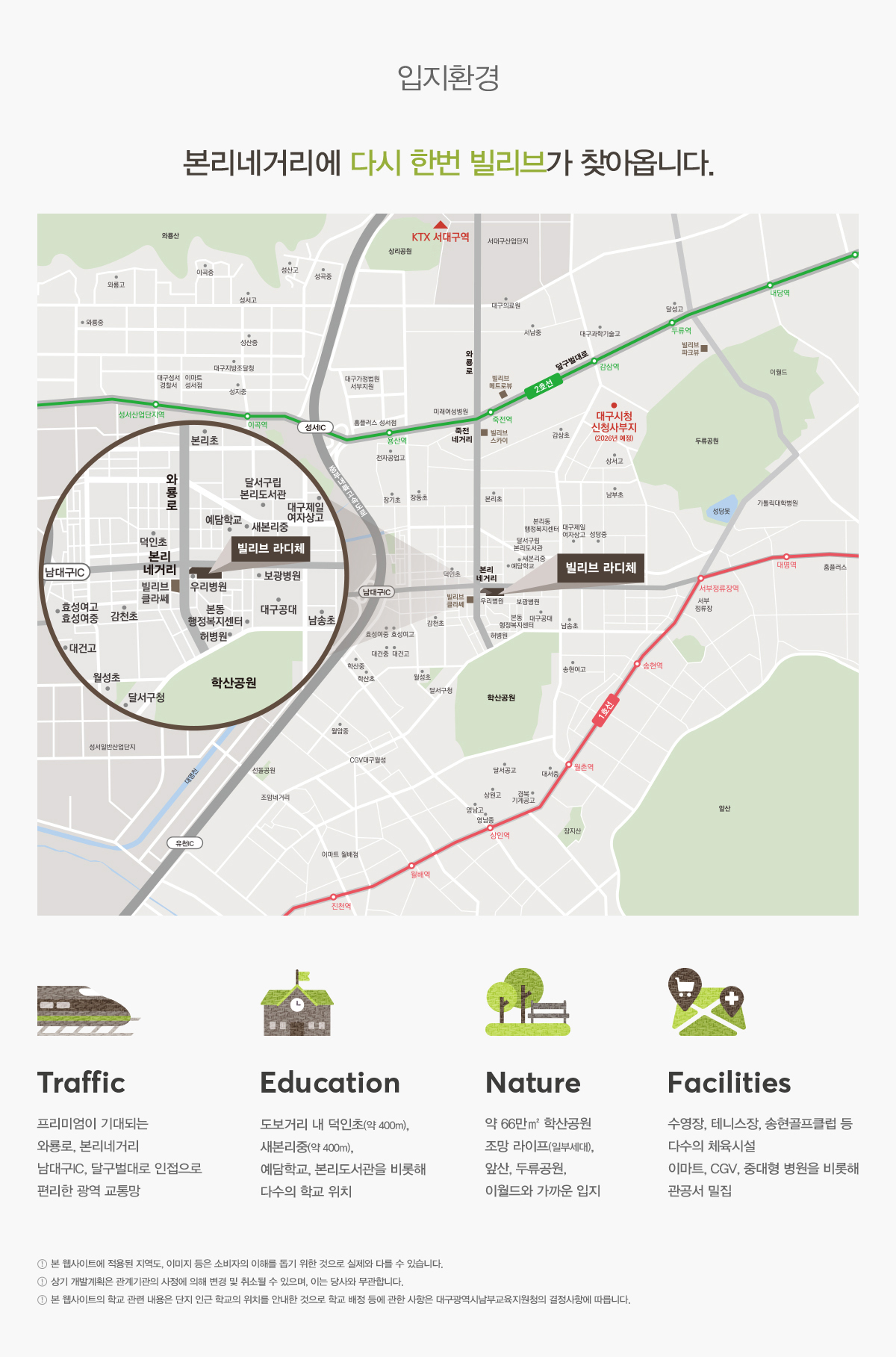 이마트·홈플러스·CGV 등 슬세권 인프라와 본동·월성동 생활권을 모두 누리는 입지입니다. 달서구청, 행정복지센터, 병의원 밀집으로 공공·의료 접근성이 우수하고, 시민이 선호하는 상권과 문화시설을 도보·단거리로 연결하는 점이 대구 신세계 빌리브 라디체의 생활 완성도를 높입니다.