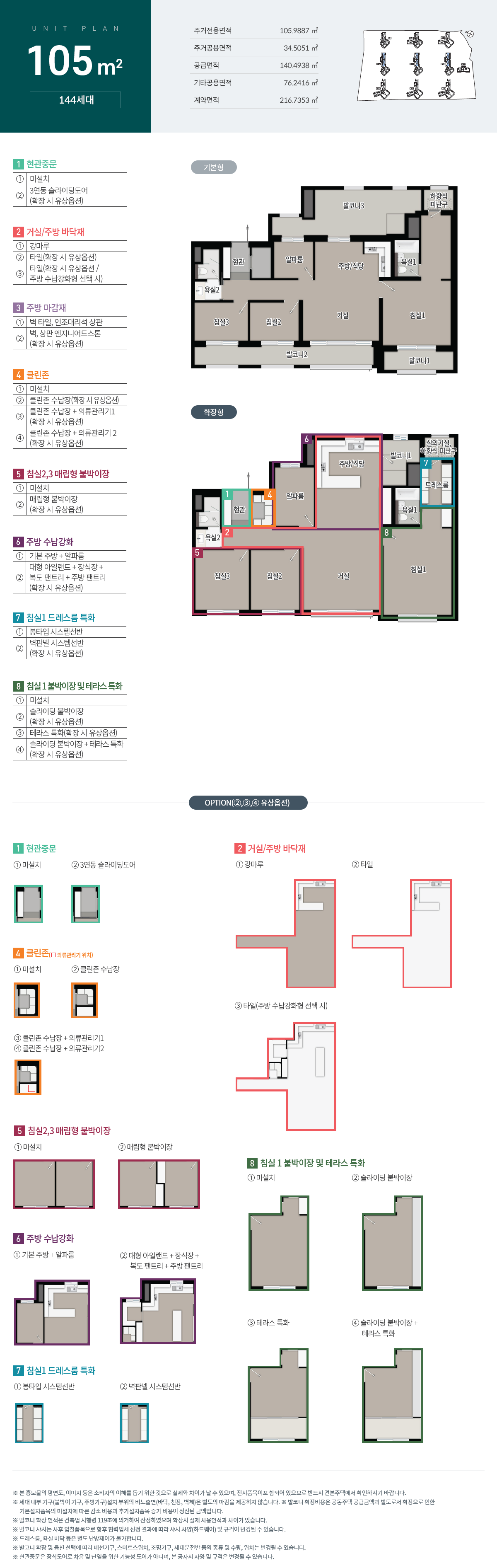 전용 59·84㎡가 주력이며 105㎡ 대형 라인업이 더해져 수요 스펙트럼을 넓혔습니다. 59A와 84A는 4베이 판상형으로 맞통풍과 채광이 우수하고, 알파룸과 대형 팬트리 등 유연한 수납 구성이 돋보입니다. 선택에 따라 알파룸을 와이드 다이닝이나 복도 팬트리로 바꾸는 등 라이프스타일에 맞춘 커스터마이징이 가능하다는 점도 매력입니다. 메인인 84B는 2베이 타워형·LDK 구조로 거실 개방감과 조망을 극대화한 타입으로, 가족 활동 공간의 밀도를 높이면서도 일조를 놓치지 않도록 계획했습니다. 실사용 빈도가 높은 주방·세탁·수납의 동선을 짧게 묶어 ‘하루의 피로’를 줄여주는 구성이 참 실용적입니다. 이런 평면 완성도는 광양 푸르지오 센터파크의 체감 가치를 키우는 핵심입니다.