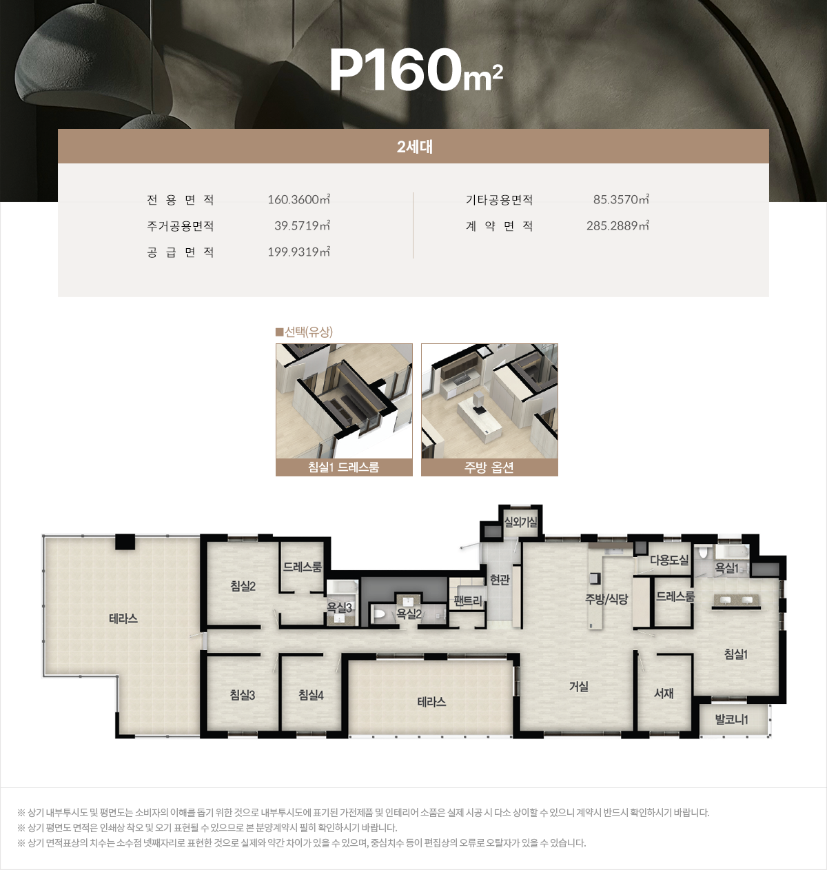 수요가 가장 두터운 전용 84㎡가 약 88%를 차지하며 A·B·C로 세분화되었습니다. 84A·84B는 판상형으로 맞통풍과 자연채광에 유리하고, 광폭 주방과 2.5m 층고가 개방감을 확장합니다. 84C는 타워형으로 이면창을 통해 채광을 강화하고 광폭 드레스룸·팬트리로 수납을 극대화했습니다. 중대형인 113·120㎡는 알파룸과 현관 창고, 오픈 발코니로 취미·재택·수납 활용도를 키웠고, 펜트하우스 160㎡는 4침실·2드레스룸·서재·2개 테라스로 하이엔드 라이프를 구현합니다. 실내 전 세대 유리 난간, 층간소음 저감 바닥, 전열교환 환기 등 쾌적성을 위한 기본기도 탄탄합니다. 여주역 로제비앙 더센텀이 상품성에서 한 발 앞선 이유입니다.