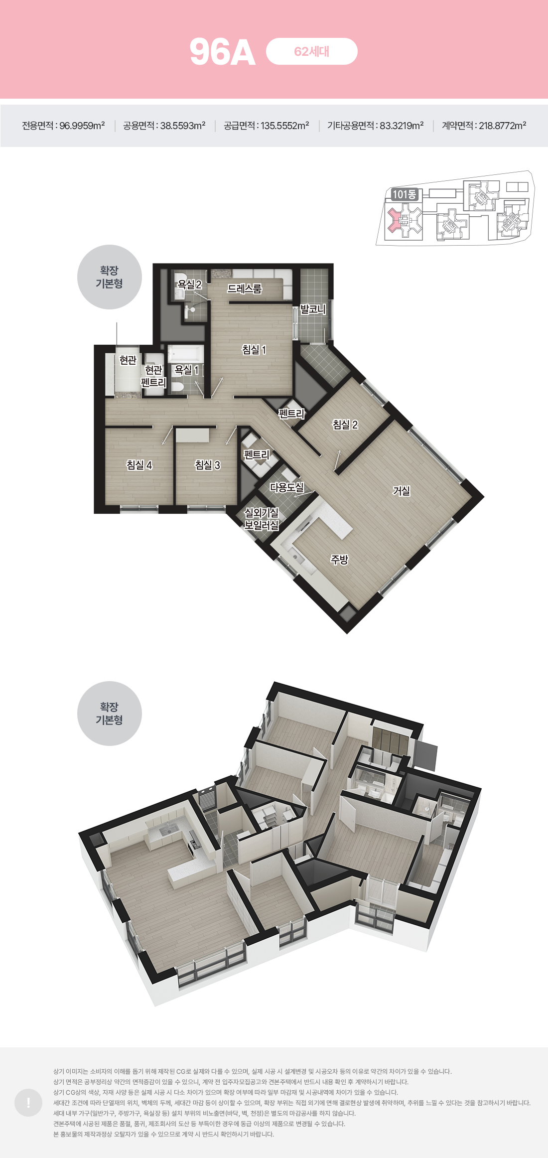 주력형은 전용 59·84·96㎡이며, 펜트 150·161㎡로 대형 수요도 대응합니다. 84A는 이면 개방형 거실로 채광·통풍을 극대화했고, 팬트리·드레스룸·다용도실로 수납 동선을 정리했습니다. 84B는 4베이 판상형으로 동선이 단순하며, 84C는 타워형 구성으로 공간 분리에 강점이 있습니다. 전반적으로 해링턴스퀘어 리버파크는 “광폭 거실+수납 특화”라는 최근 트렌드를 성실히 반영해 가족 구성 변화에도 유연하게 대응합니다.