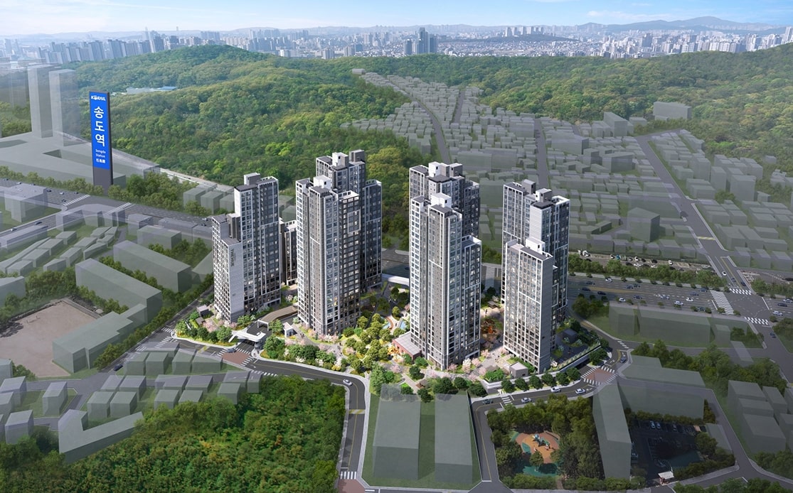 송도역 한신더휴 프레스턴은 인천 연수구 청학동 96-4번지 일원, 영남아파트 재건축정비사업으로 추진되는 단지입니다. 대지 23,055.2㎡, 건폐율 18.73%, 용적률 249.96%로 계획되어 과밀하지 않고 숨 쉴 틈을 남겼습니다. 지하 2층~지상 29층, 총 8개 동과 829대 주차(근생 10대 포함, 세대당 평균 1.25대)를 갖추며 지상 공원화와 차량·보행 동선 분리로 안전성을 높였습니다. 주동은 L·T형 배치와 남향 위주 설계, 41% 조경률로 채광·통풍·녹지 접근성을 동시에 잡았습니다.