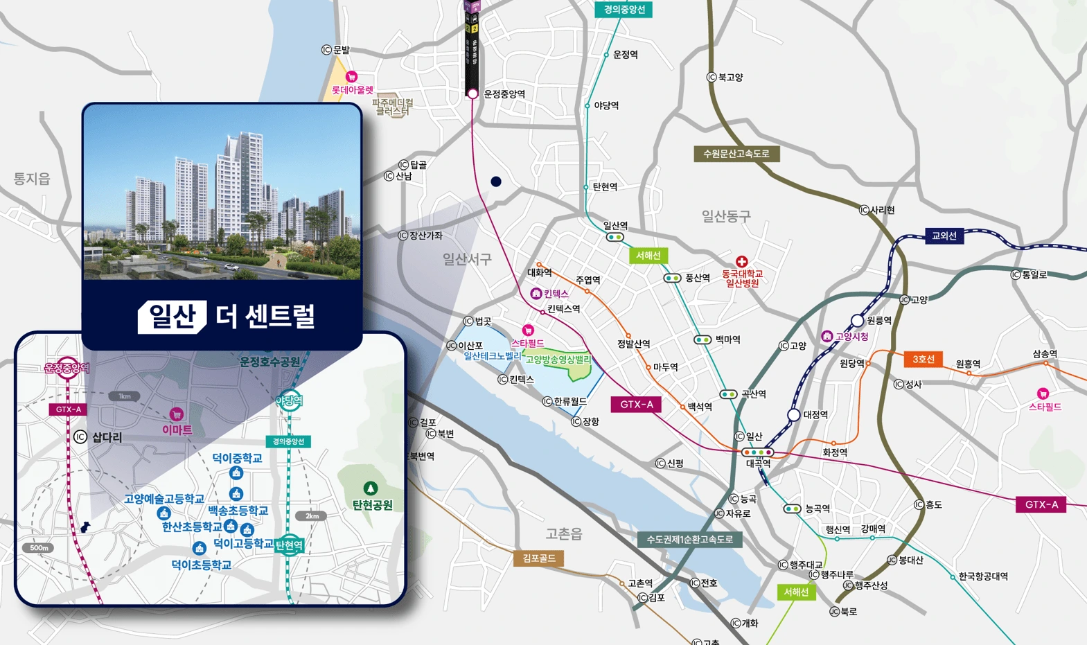 자유로와 서울문산고속도로, 수도권 제2순환 일부 구간이 차량 이동의 분산 루트가 되고, GTX-A와 3호선 네트워크가 철도 출퇴근 시간을 예측 가능하게 만듭니다. 킨텍스–대곡–연신내–서울역으로 이어지는 급행 축의 체감은 분명하며, 환승 허브와의 결합은 일상 피로를 줄여 주어 결과적으로 일산 더 센트럴의 환금성까지 보강합니다.