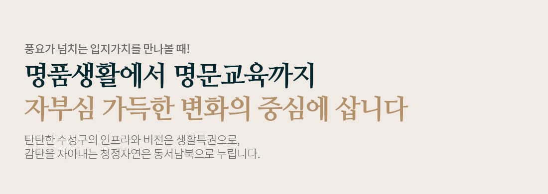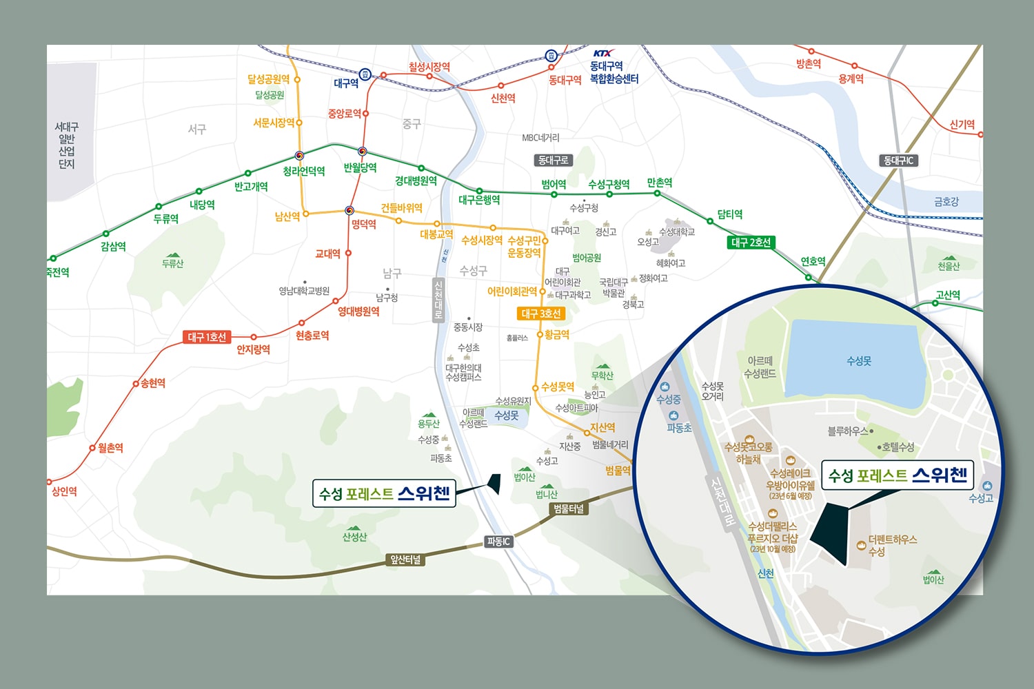 반경 1.5km 내 파동초·수정중이 포진해 안전한 통학 동선이 가능하며, 학부모 선호도가 높은 경신중·경북고·능인고 등으로의 진학 접근성도 좋습니다. 차량 10분권에 밀집한 학원가 이용도 편리합니다. 학령기 자녀가 있는 3~4인 가구에게 수성 포레스트 스위첸의 교육 환경은 실질적인 체감가치를 제공합니다.