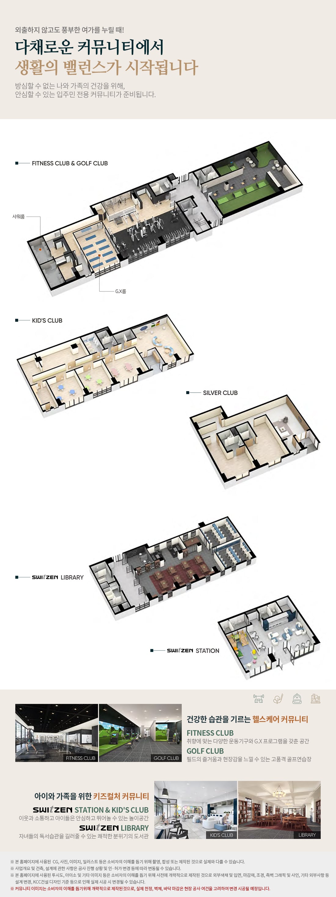 커뮤니티는 생활의 디테일을 바꿉니다. 단지 내 피트니스, GX룸, 실내 골프연습장으로 출퇴근 이후의 운동 루틴이 쉬워지고, 독서실·그룹스터디룸은 자녀 학습과 성인 자기계발의 동선을 집 안으로 끌어옵니다. 어린이집·키즈클럽·맘스 스테이션은 영유아 가구의 돌봄 공백을 완화하고, 시니어센터·주민회의실 같은 커뮤니티는 세대 간 교류를 자연스럽게 만듭니다. 주말이면 조경을 따라 이어지는 산책로와 수경시설을 중심으로 ‘머무는 주말’이 일상이 됩니다. 수성 포레스트 스위첸이 내세우는 ‘에코 라이프’의 골격이 바로 이 내부 커뮤니티입니다.